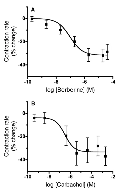 In neonatal rodent cardiomyocytes, berberine causes the contraction rate of the heart to drop ⁴.