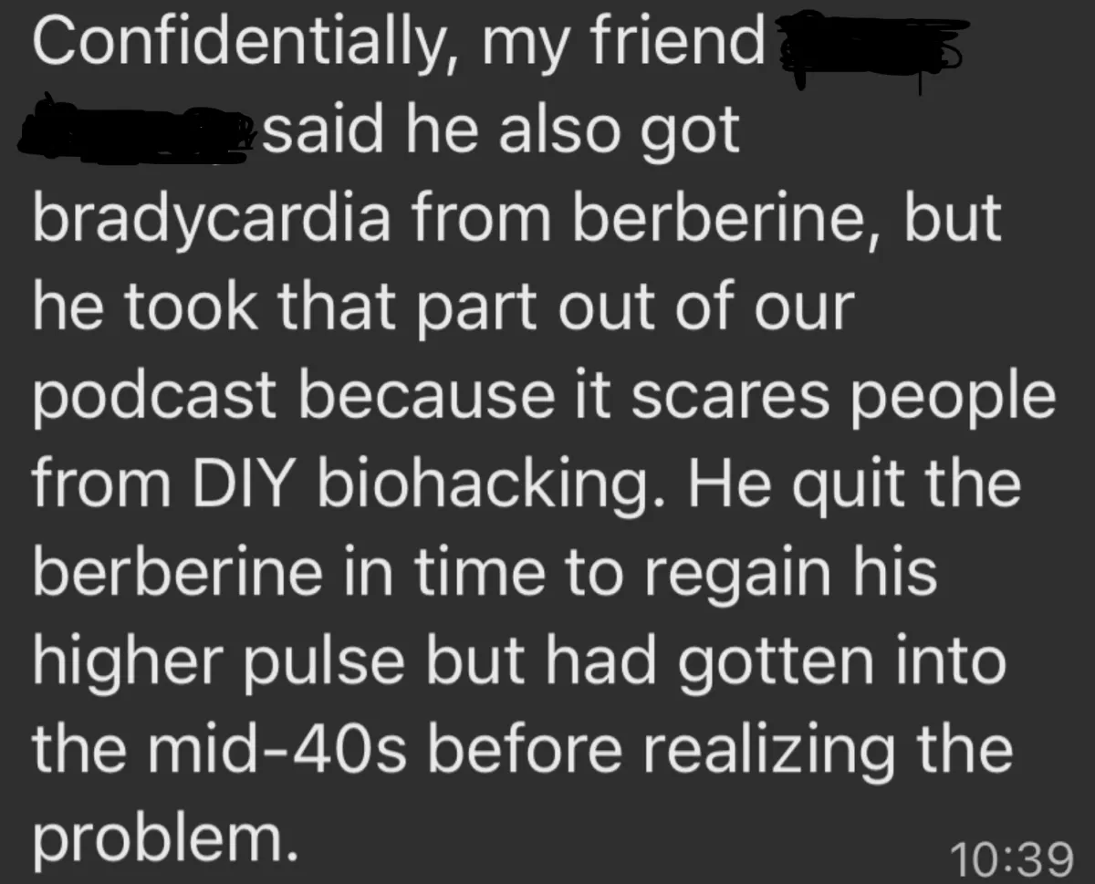 And this is not the only case of this happening. This clients friend, a renown longevity influencer, had a similar scare, though did not end up with a pacemaker because he caught the problem soon enough. Unfortunately he didn’t want to share that story with anyone because he was worried it might turn people away from biohacking.